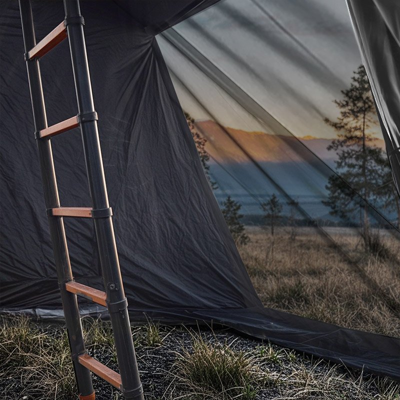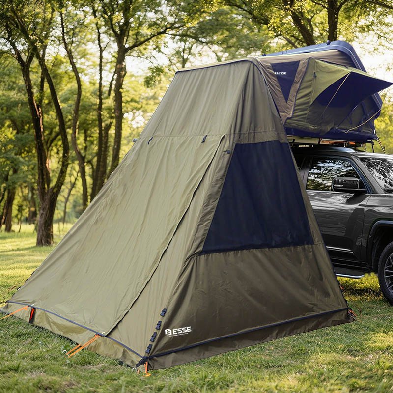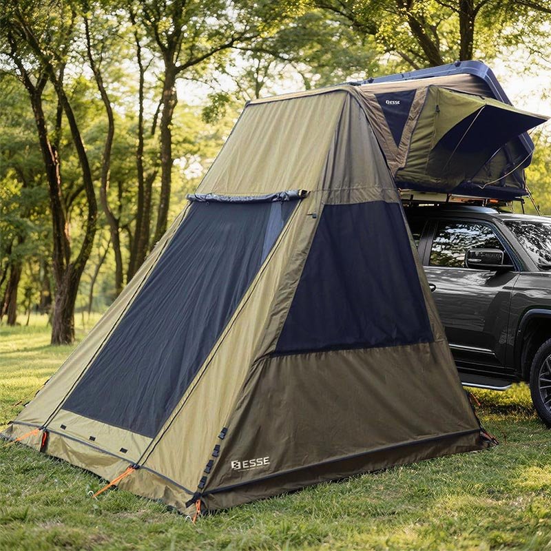 The DRAGON FLY SHELTER is a dedicated, floorless annex that zips directly to the Dragon Fly rooftop tent, creating an instant private room at ground level. Use it as a changing room, shower space, or a protected entry to keep the ladder and footwear out of the weather. Full-height panels and a large door deliver easy access, while generous mesh windows promote cross-ventilation and keep insects out. Storm flaps help shed rain, and the simple zip-on design makes setup fast at any campsite.