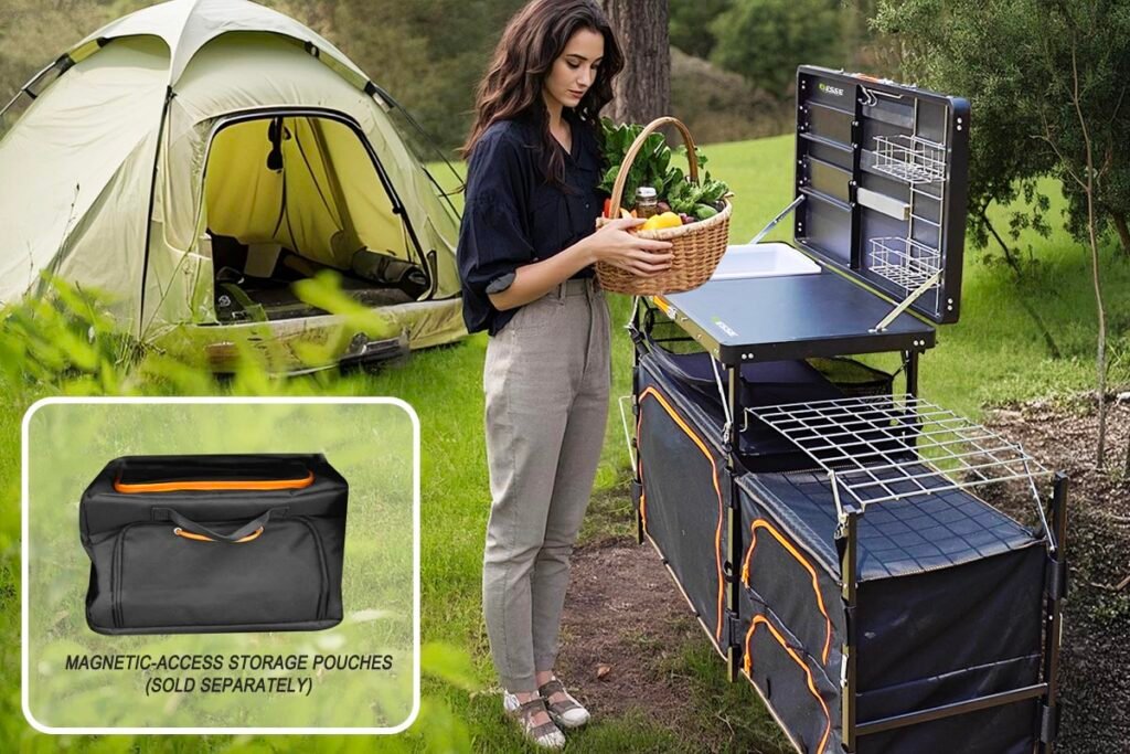 Compatible accessories available: cooler bags, utensil organizers, and magnetic-access storage pouches (sold separately).